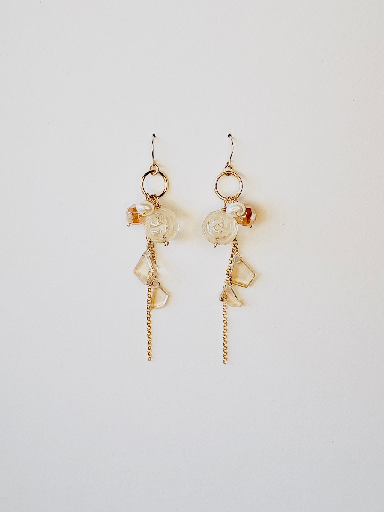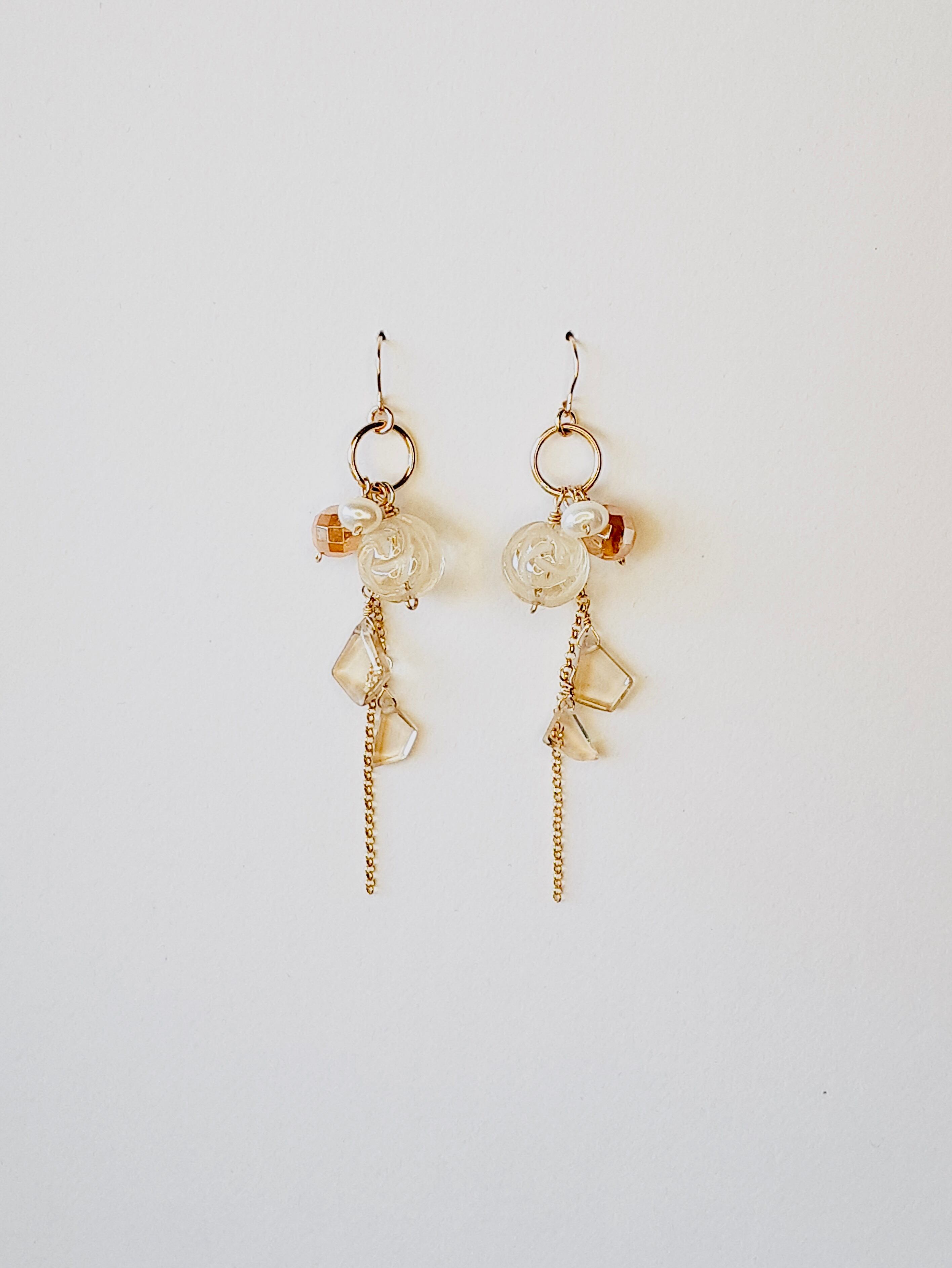 3種のシャンパンカラークオーツと淡水パールのピアスです。