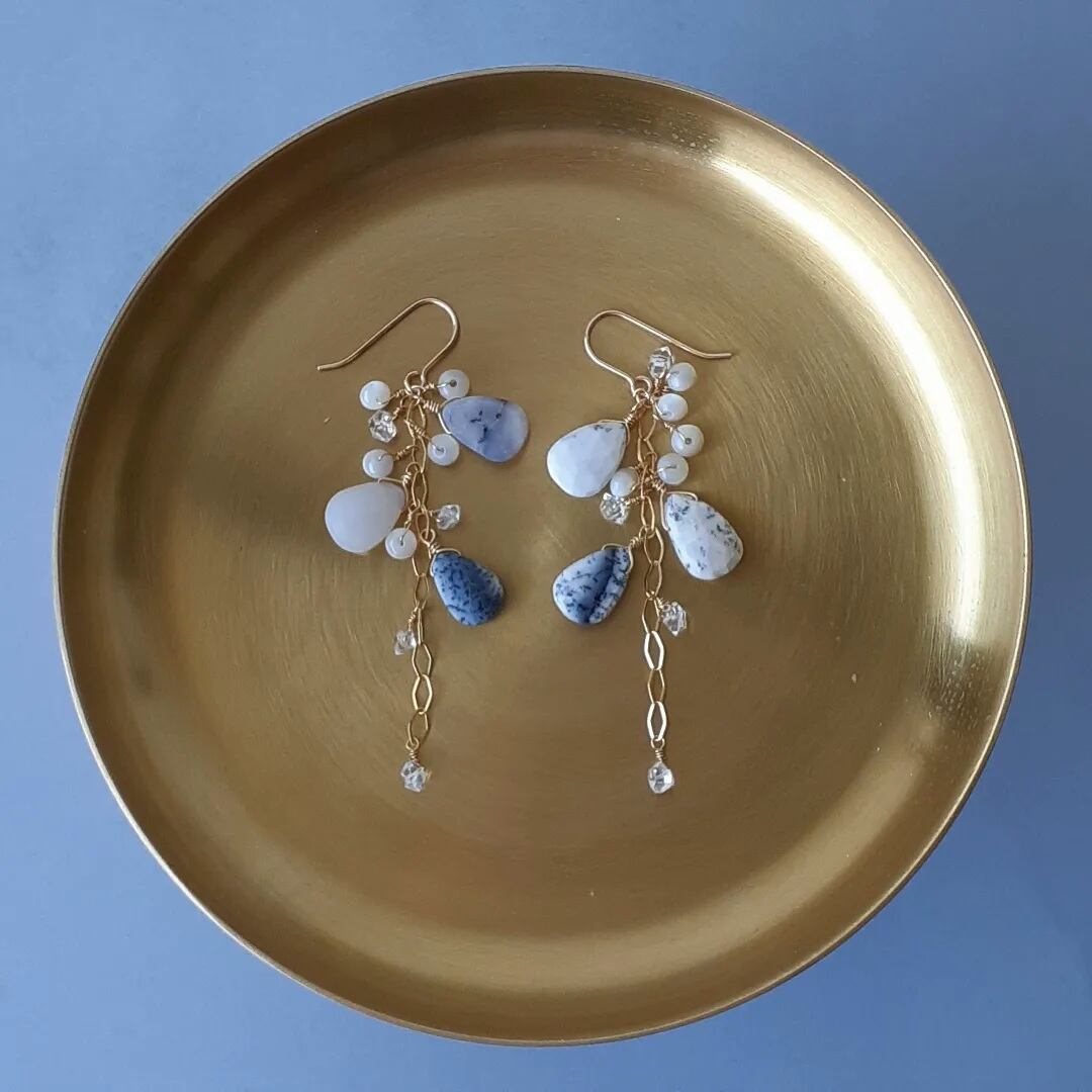 マーブル模様がニュアンスたっぷりのデンドライトオパールに、キラリと光るハーキマーダイヤモンド、ミルキーホワイトのマザーオブパールをシャラシャラさせたピアスです。