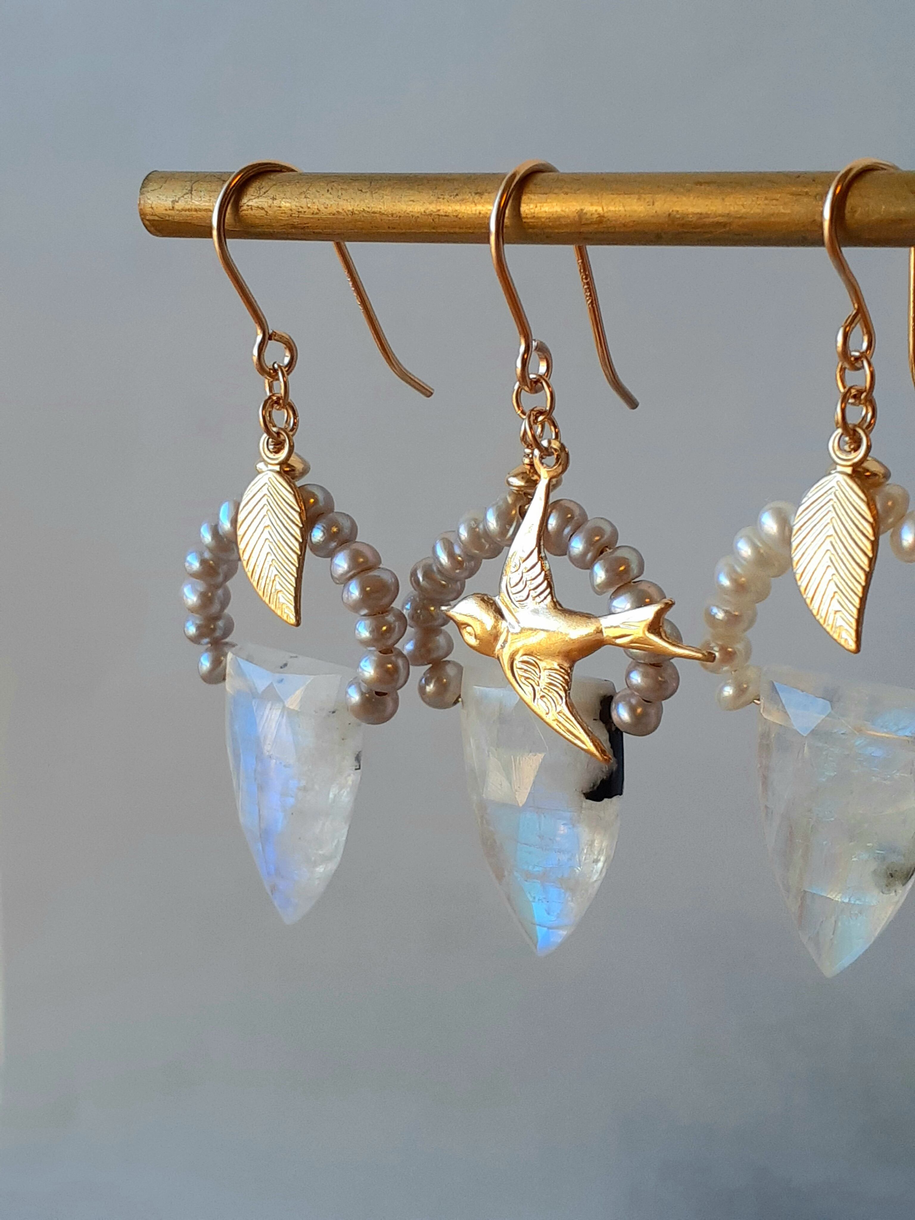 ●ホワイトラブラドライト、淡水パール(グレー)、14kgf製チャーム(小鳥、リーフ)