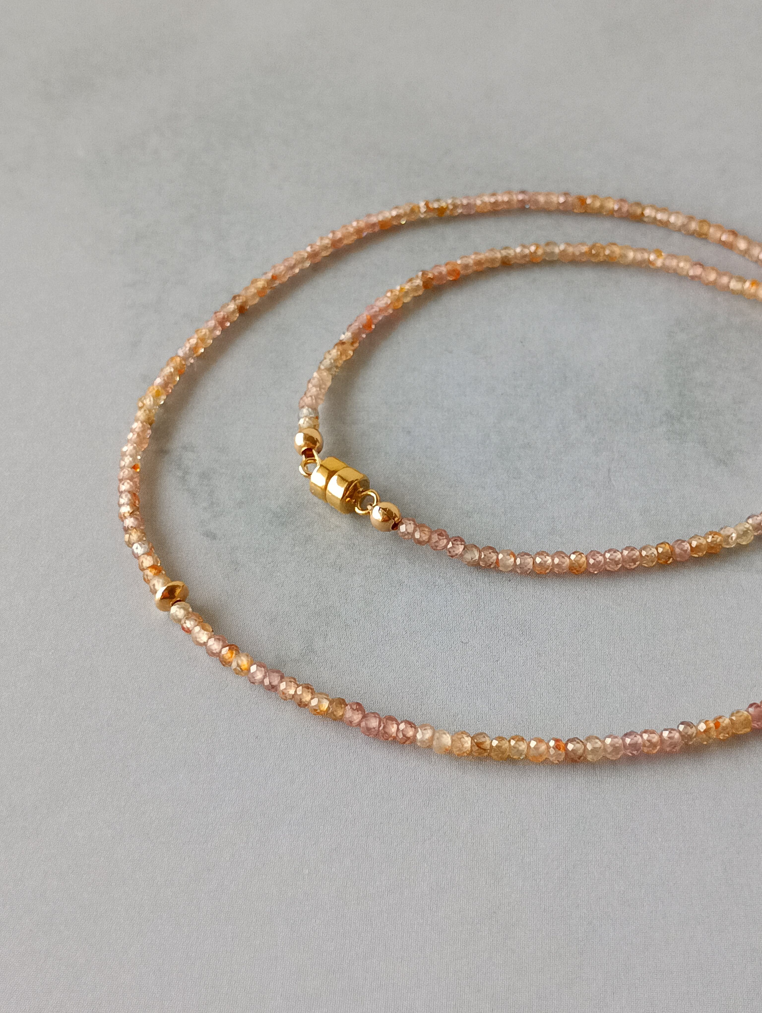 ベージュ寄りのピンクカラーが肌馴染みよく、ジルコンらしいしっかりとした輝きが首元を華やかに。ひと粒添えたゴールドが程よいアクセントです。