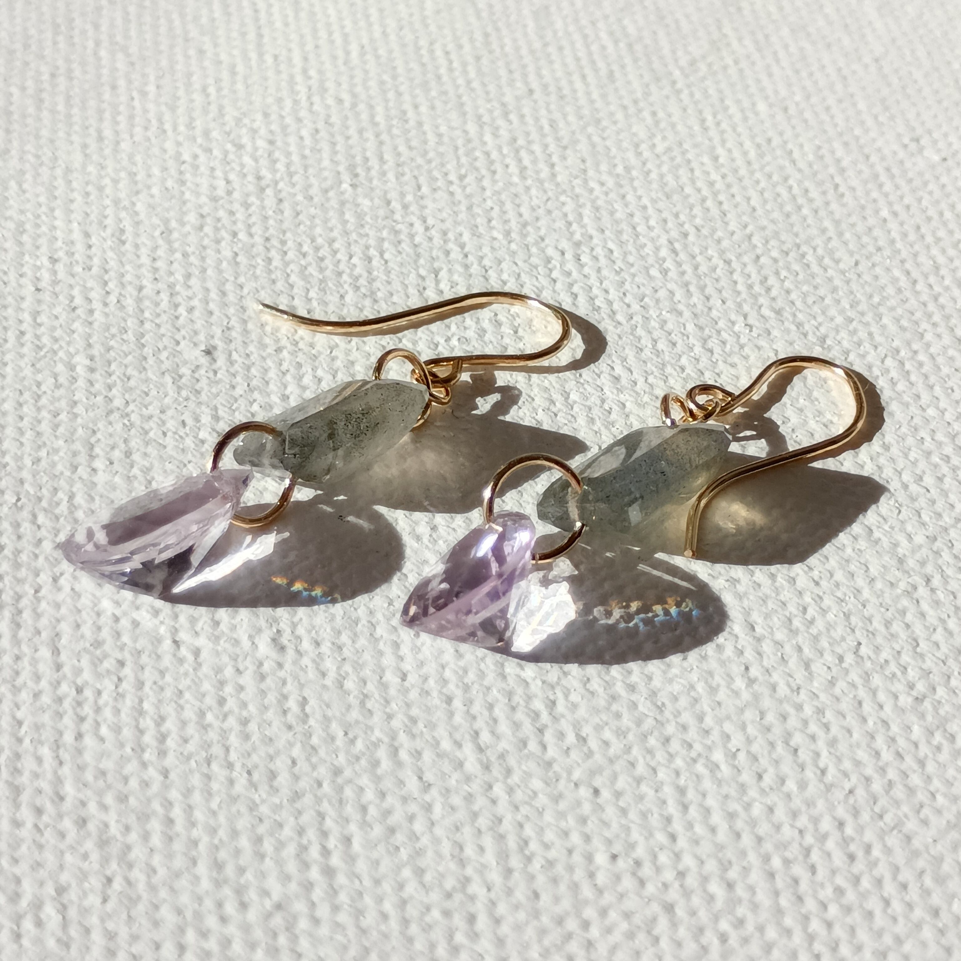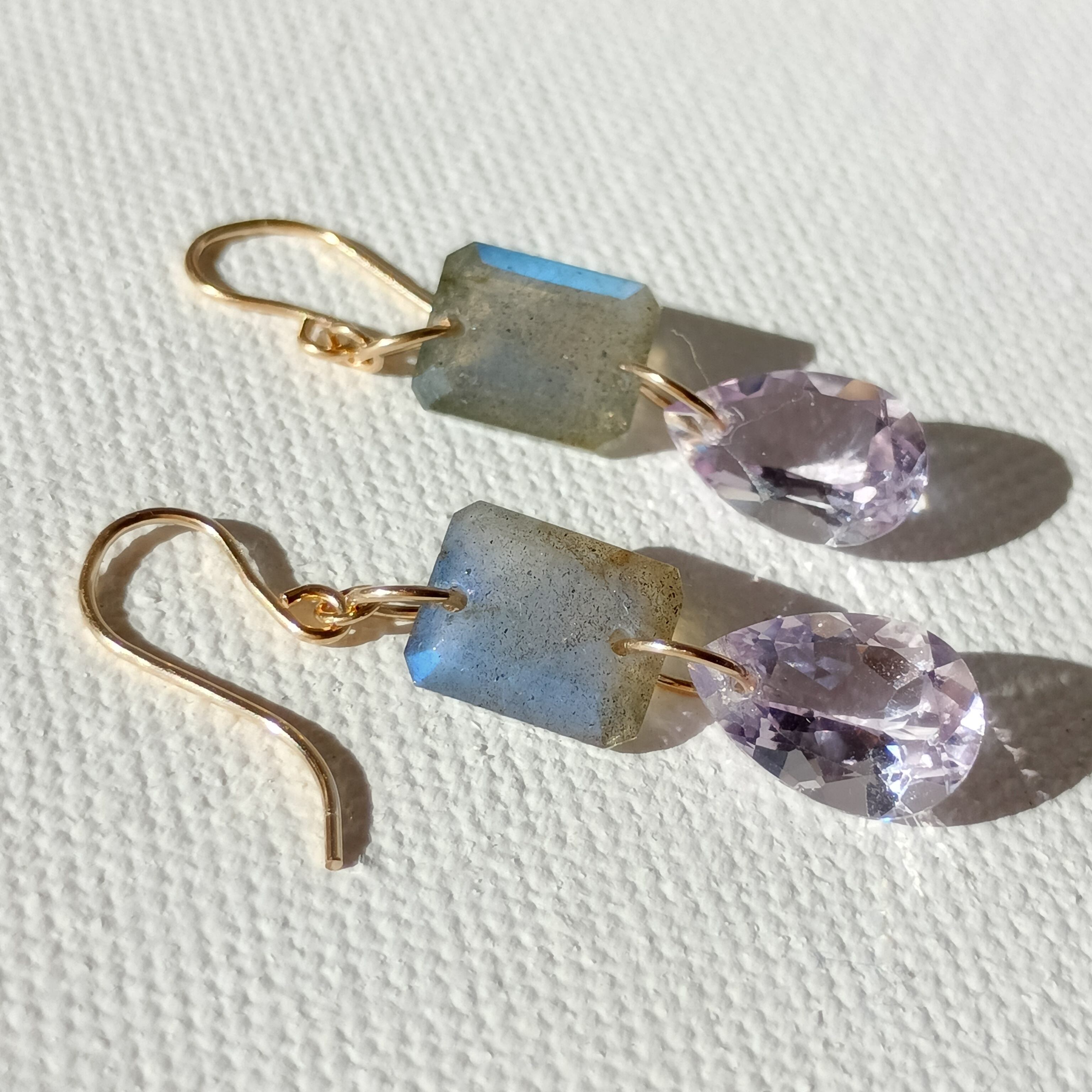 カットの美しい宝石質のピンクアメシストに、ラブラドレッセンス(青い光)がしっとり輝くラブラドライトを合わせたピアスです。